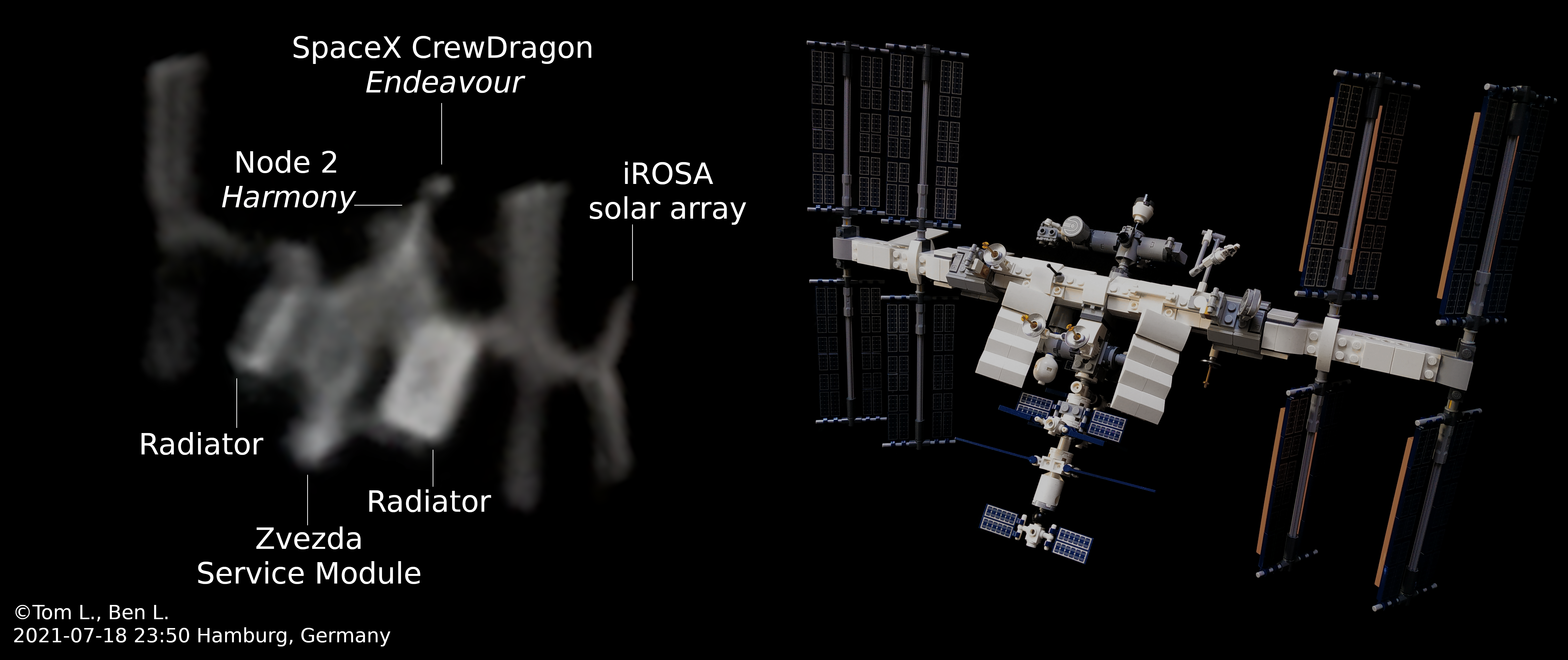 I was surprised how much detail you can see with a phone camera and a small Dobsonian telescope. We just set the phone camera to video (low exposure time is key for the fast and bright ISS) and then manually moved the telescope to follow the ISS. The left half of the image is the best frame we got that day. On the right is the LEGO set of the ISS for comparison.
